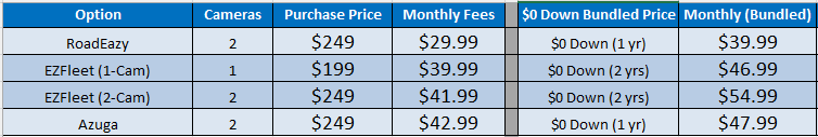 + RoadEazy – Least Expensive + EZ Fleet – Medium Priced + Azuga – Highest End-$0 Down Options Contact RPM Global Connect to learn more about the program. First NameLast NameJob Title *Phone NumberEmail Address *Company *Whats your fleet size? *Message Request Call RoadEazy Purchase PlanUp-front Cost: $249.00Monthly Service: $29.99/month (month-to-month)Bundled PlanUp-front Cost: $0 DownMonthly Service: $39.99 a month (1 year contract) EZFleet 1-Camera Option (Road Only Facing)Purchase PlanUp-front Cost: $179.00 (+ tax, shipping, handling)Monthly Service: $39.99/month (month-to-month)Bundled PlanUp-front Cost: $0 DownMonthly Service: $44.99/month (2-year contract) EZFleet 2-Camera Option Road and Driver FacingPurchase PlanUp-front Cost: $219.00 (+ tax, shipping, handling)Monthly Service: $41.99/month (month-to-month)Bundled PlanUp-front Cost: $0 DownMonthly Service: $46.99/month (2-year contract) A.I. Azuga 2-Camera System with GPS Purchase PlanUp-front Cost: $249.00 (+ tax, shipping, handling)Monthly Service: $42.99/month (month-to-month)Bundled PlanUp-front Cost: $0 DownMonthly Service: $47.99/month (1-year contract)